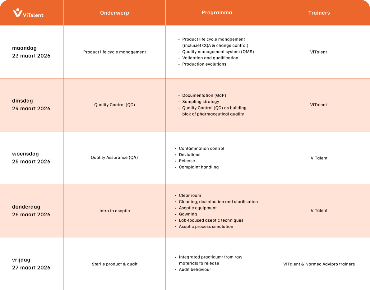 Klassieke opleidingen bieden een brede basis, maar missen de directe link met de snel evoluerende realiteit op de werkvloer. Net daar ligt voor veel bedrijven de uitdaging: nieuwe medewerkers efficiënt de juiste skills aanleren, zodat ze hun talent en vooropleiding maximaal kunnen inzetten in het bedrijf. Dit is al helemaal een uitdaging binnen de complexe wereld van GMP-productiebedrijven. Met deze micro-credential kiest ViTalent bewust voor een gerichte aanpak. Een korte, sectorgerichte academische opleiding die focust op specifieke vaardigheden die onmiddellijk inzetbaar zijn op de werkvloer. Binnen het bredere ecosysteem van bedrijven, onderwijs en opleidingspartners in Vlaanderen biedt ViTalent met deze aanpak een cruciale oplossing om de competentiekloof te overbruggen.